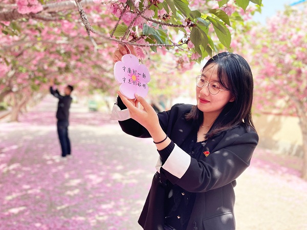 山东省莱阳市姜疃镇纪委借助举办樱花节,组织纪检监察青年干部开展“花语品廉”活动,营造知廉、敬廉、践廉的良好风尚。图为纪检监察青年干部在悬挂“廉洁格言”花型牌。(山东省莱阳市纪委监委供 张一 摄)