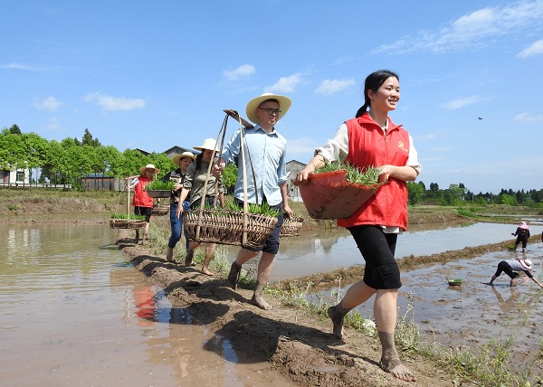 四川省达州市渠县纪委监委组织青年党员干部组成“帮帮团”,走村串户,深入田间地头帮助缺少劳动力群众起运秧苗、插秧种田。(四川省达州市纪委监委供 邓良奎 摄)