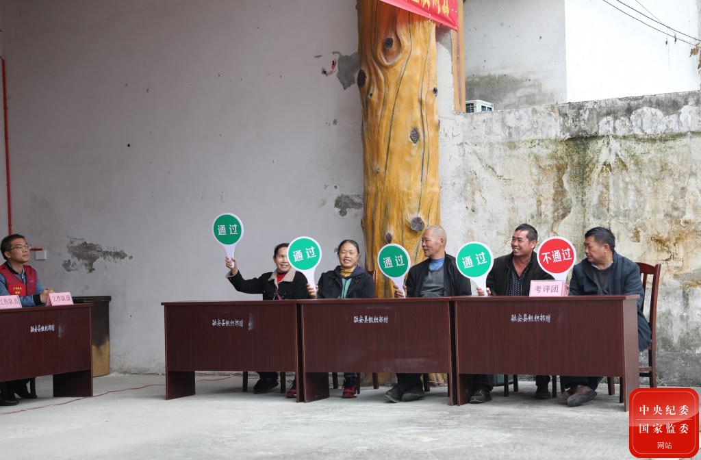 广西壮族自治区融安县纪委监委把群众急难愁盼问题作为切入口,通过召开“阳光问廉”质询会,让干部和群众面对面交流,把问题摆在桌面。面对质询,被问廉对象直面问题、照单全收、承诺限时整改。图为群众考评团就被问廉对象的回答进行“打分”评价。(广西壮族自治区融安县纪委监委 黄曦 摄)