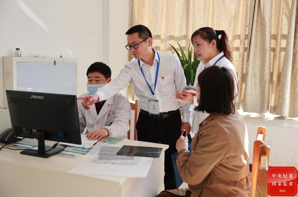 江西省寻乌县纪委监委聚焦行业乱象,深入开展医疗卫生系统作风和腐败问题专项督查,推动解决“看病难”“看病贵”等群众急难愁盼问题。图为督查组工作人员在寻乌县人民医院询问药品和医疗器械采购、医务人员收红包拿回扣等情况。(江西省寻乌县纪委监委 钟琼 摄)