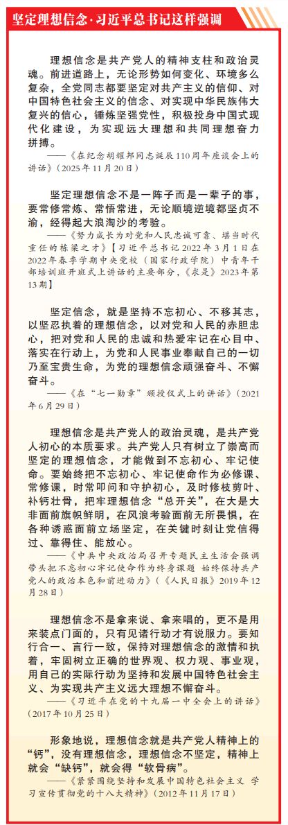 求木之长者,必固其根本。理想信念是共产党人的精神支柱和政治灵魂,是立党兴党之基,更是党员干部安身立命之本。习近平总书记指出,“坚定理想信念是终身课题,需要常修常炼,要信一辈子、守一辈子”。只有理想信念坚定、党性坚强,才能不论风吹雨打,不怕千难万险,坚定不移为实现既定目标而奋斗。